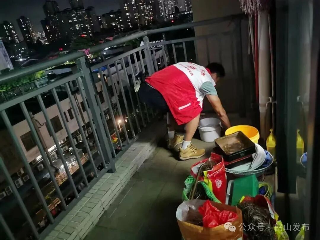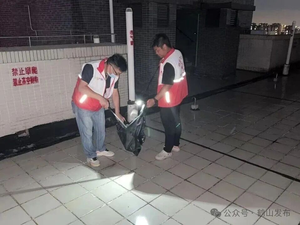 沙坪街道南山社区工作组在部分楼栋照明条件有限的情况下,使用手机照明,完成对楼道、天台等公共区域卫生黑点的排查清理任务,确保不留卫生死角。